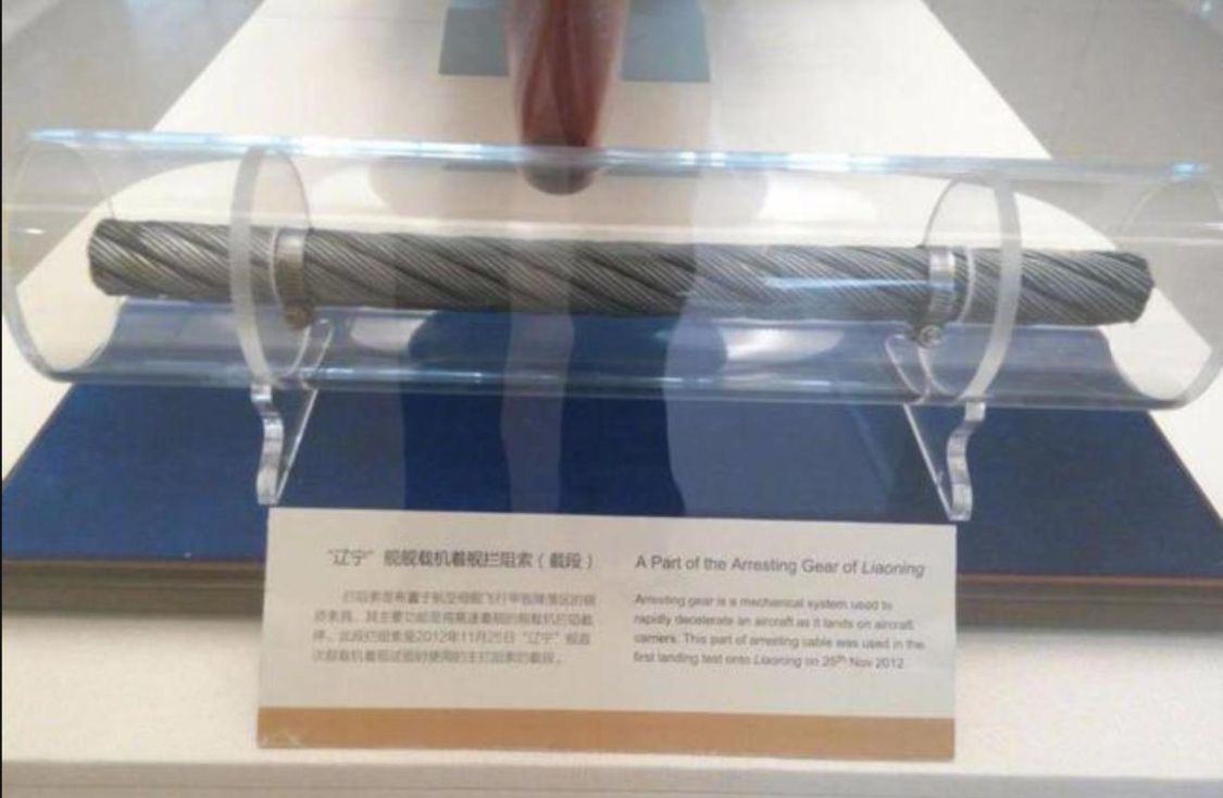 这张照片是中国海军航母辽宁舰上的一小段拦阻索,在2012年11月25日,航母辽宁舰首次进行了歼-15舰载机的着舰试飞。试飞结束以后,舰上的拦阻索被拆下来进行强度研究。为了纪念这次试飞,主拦阻索的一个截断被保存在某海军基地。