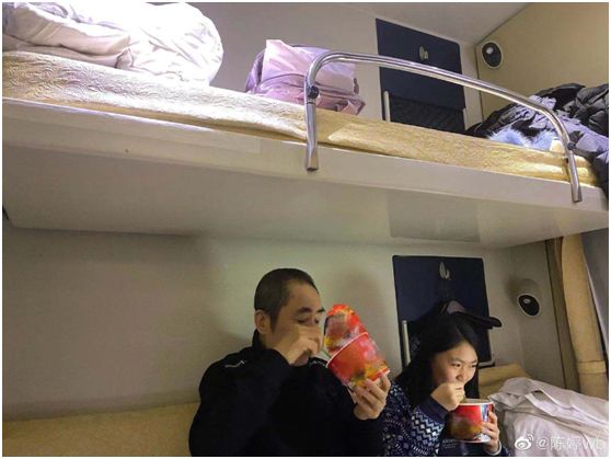 昨晚22时45分,张艺谋妻子陈婷在微博晒出一张张艺谋和女儿在火车上吃泡面的合照,配文:“感谢龙江高速交警和哈尔滨火车站,让我们顺利赶上了火车,吃上了晚饭。”