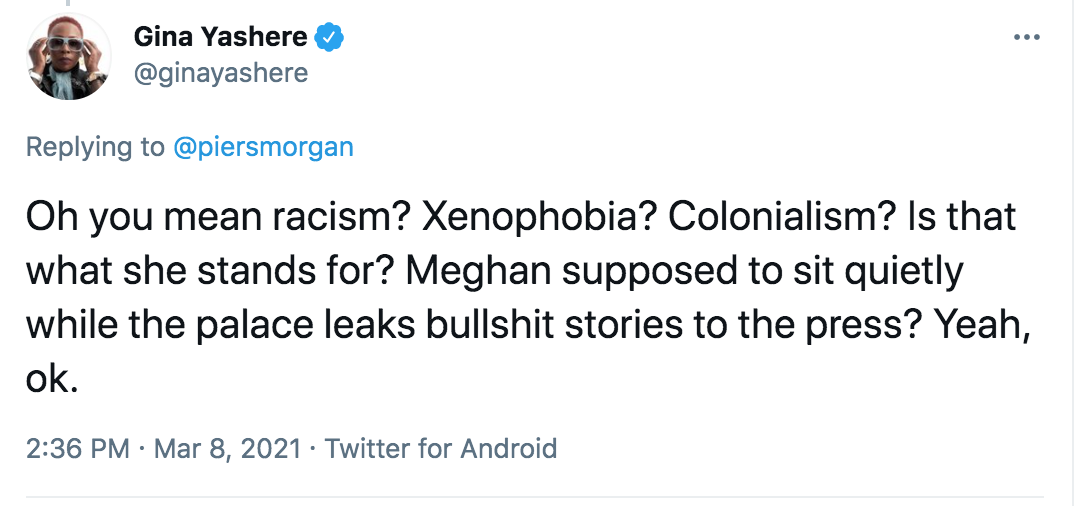 “种族歧视、仇外心理、殖民主义,这就是女王所代表的一切吗?梅根应该安静地坐着,而王室却可以向媒体披露狗屁故事?呵呵。”