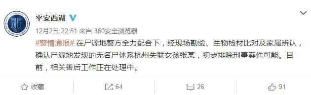 中新网12月3日电 杭州市公安局西湖区分局2日晚间在官方微博发布通报称,在尸源地警方全力配合下,经现场勘验、生物检材比对及家属辨认,确认尸源地发现的无名尸体系杭州失联女孩张某,初步排除刑事案件可能。目前,相关善后工作正在处理中。