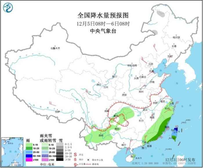 图3 全国降水量预报图(12月5日08时-6日08时)