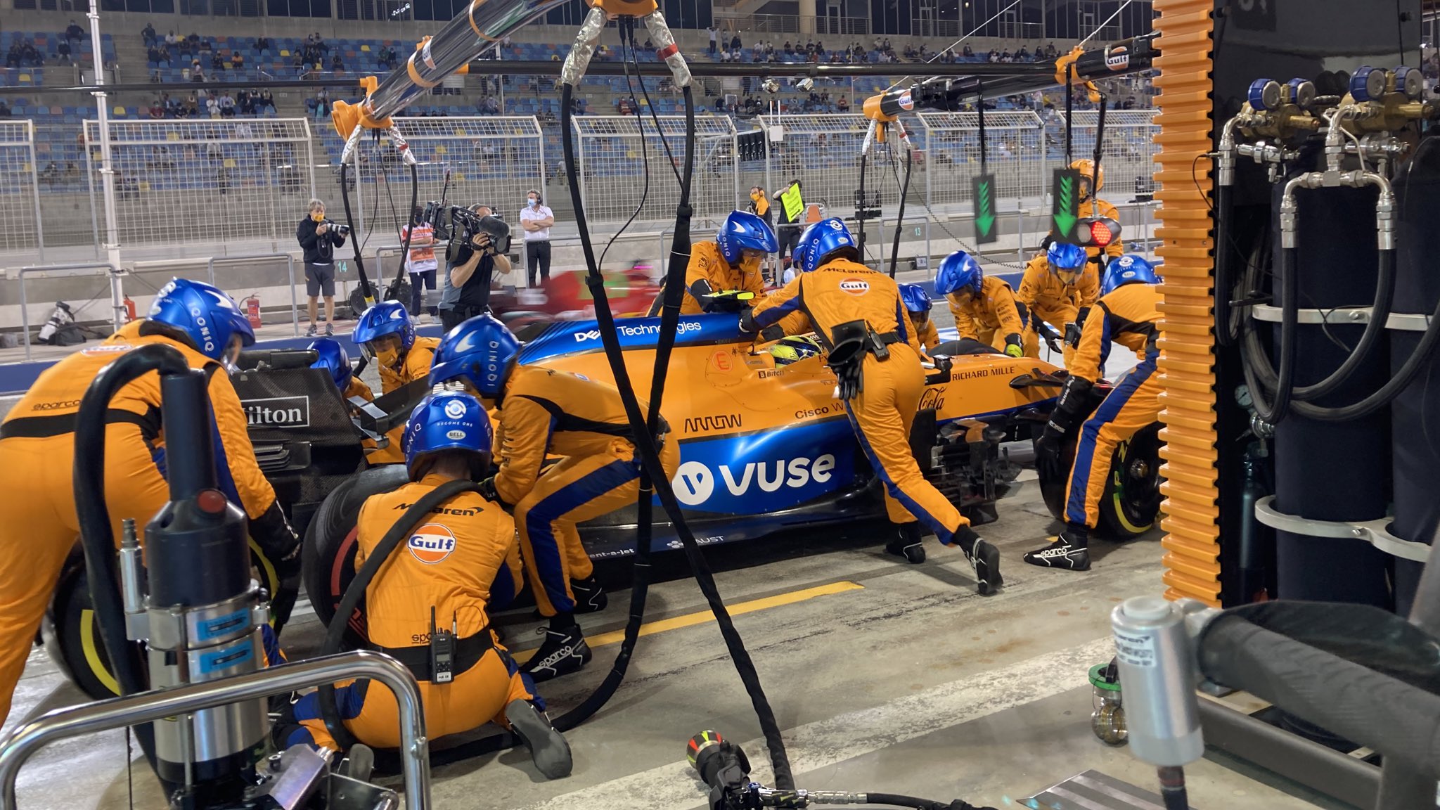 第13圈,诺里斯和勒克莱尔同圈进站,换胎为勒克莱尔减少了0.3秒差距,但法拉利未能通过进站超越迈凯伦。
